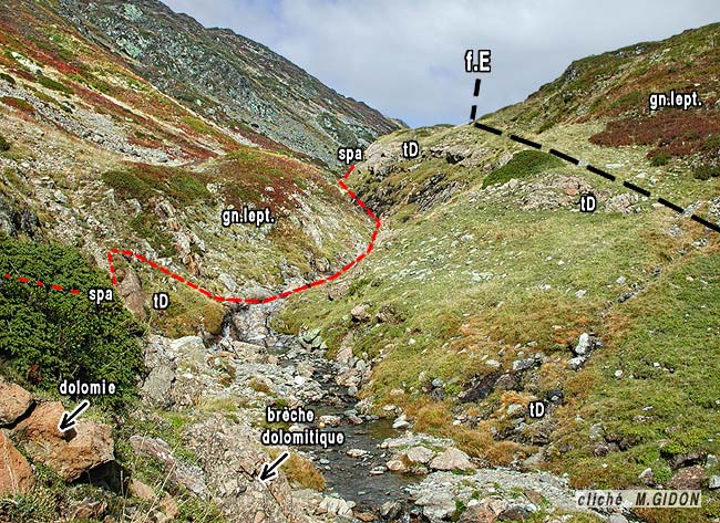 ![]() Le fond du ravin de l'Échaillon vu du sud, 500 m au nord du refuge du Taillefer f.E = faille de l'Échaillon ; le pendage des couches du Trias est variable, souvent assez fort, mais toujours dirigé vers la droite (vers l'est) ; c'est le compartiment oriental (crête de la Céa) qui est remonté par le jeu de la faille. |