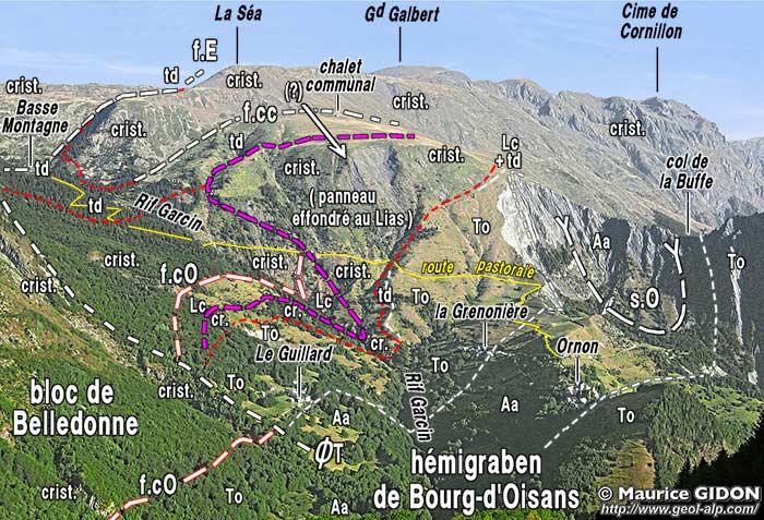 Depuis le sommet du Grand Galbert se détache vers le sud l'échine de la montagne de la Séa, qui domine Oulles du côté est et qui s'abaisse progressivement jusqu'au refuge du Taillefer. Au delà elle est tranchée par l'entaille de la Jasse que draine le Rif Garcin, qui descend sur La Grenonière d'Ornon (voir la page "Ornon"). Cette crête de la Séa est séparée du "plateau des lacs", qu'elle domine nettement, par le ravin de l'Échaillon qui s'encaisse selon un tracé N-S avant de déboucher du côté sud peu à l'ouest du refuge du Taillefer. Ce ravin s'avère suivre une faille extensive N-S, à regard ouest, la faille de l'Échaillon, dont la présence explique la surélévation de l'échine de la Séa par rapport au plateau du Lac Fourchu.