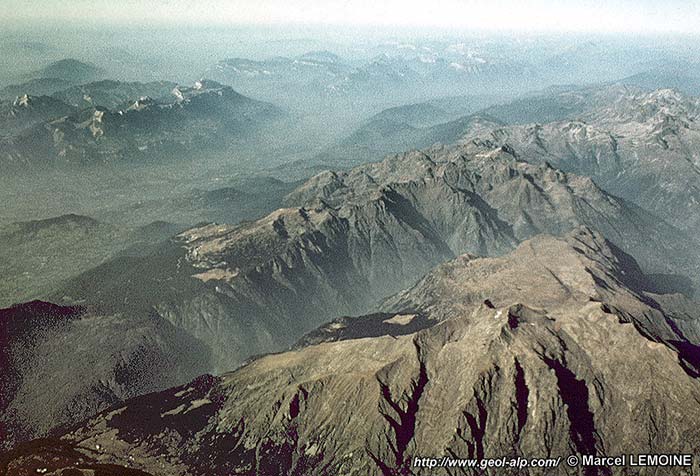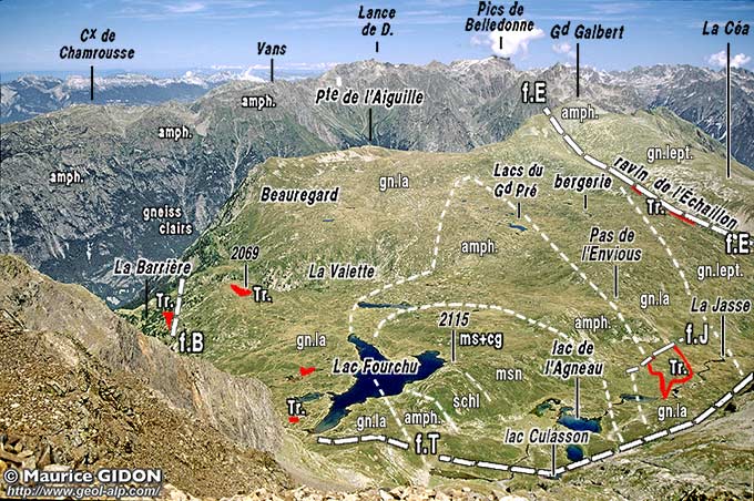 La faille de la Petite Vaudaine se prolonge par celle du ravin de l'Échaillon et celle des Lessines par celle des chalets de La Barrière. En ce qui concerne la faille de la Pra son prolongement vers le sud est moins clair car il aboutit sous la Pointe de l'Aiguille, dans un secteur où le côté nord-ouest de cette crête est affectée par un début de tassement en masse. En fait on ne trouve sur le palteau des lacs supérieurs auun tracé qui semblecorrespondre à son importance : il semble donc qu'elle doit se raccorder à celle des Lessines, aux environs des chalets de la Barrière pour ne plus constituer qu'une cassure unique, la faille de la Barrière. Au sud du plateau des lacs les données cartographiques existantes ne permettent guère de savoir selon quel tracé ces failles se poursuivent dans les crêtes du Taillefer, au sud du chevauchement du Taillefer, mais l'importance de leurs rejets fait que cette prolongation y paraît a priori inévitable. |