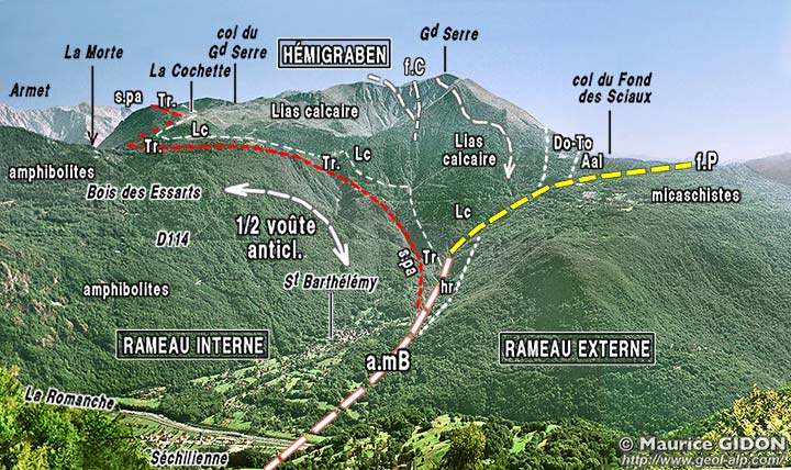 La structure très simple des couches sédimentaires du Grand Serre, en demi-voûte moulée sur la surface du socle cristallin, comporte toutefois diverses complications de détail. Elles apparaissent surtout dans les alpages du versant occidental de la montagne.