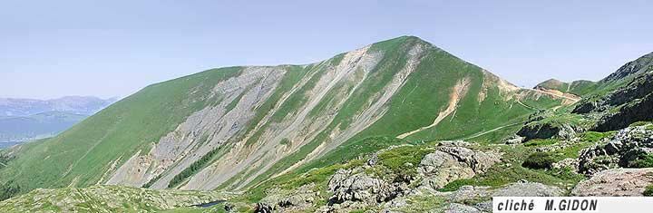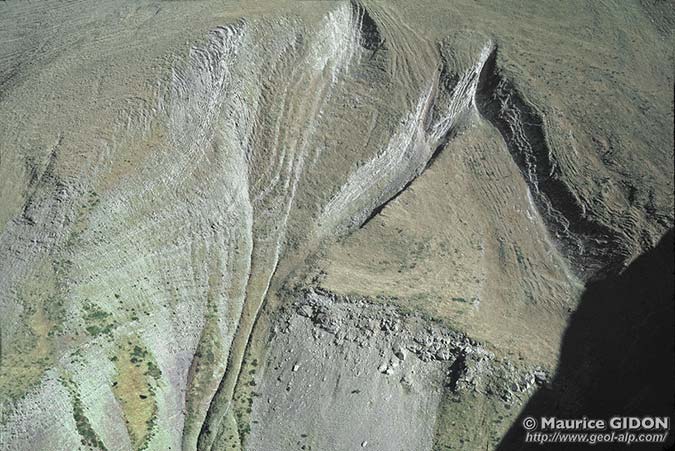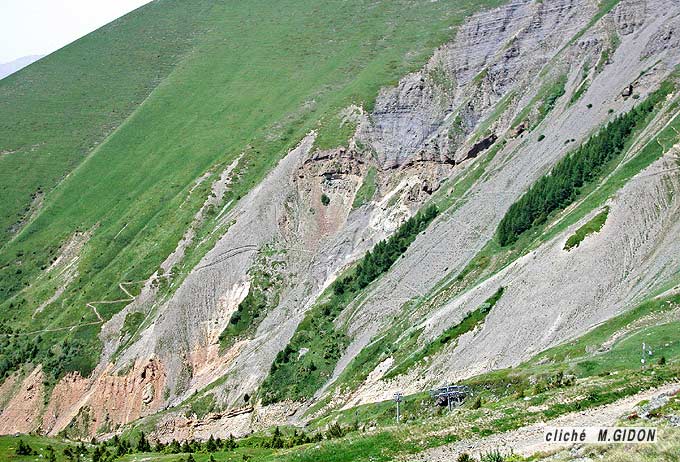 Les couches des raides pentes herbeuses de ce versant occidental de la montagne plongent donc globalement de façon assez conforme au pendage moyen des couches. La forte déclivité de ce pendage est à l'origine d'un arrachement local assez exemplaire, par glissement sur des dalles structurales.