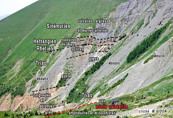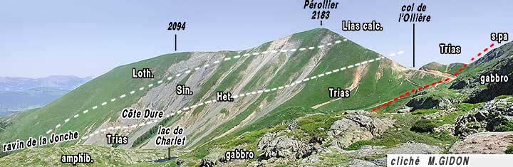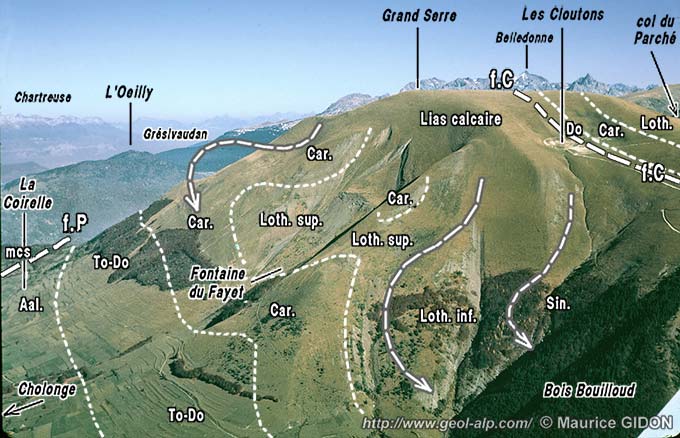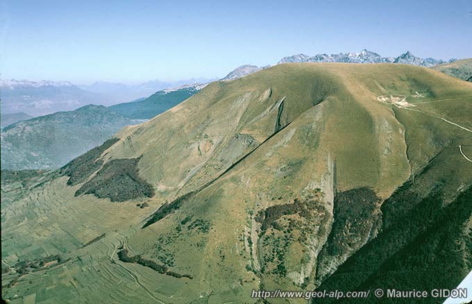 À l'extrémité nord de l'échine de la montagne (col du Fond des Sciaux) les couches liasiques font brutalement place aux micaschistes du rameau externe de Belledonne, et plus à l'est, dans le ravin du Grand Rif, aux affleurements assez disloqués de Trias et de Houiller qui jalonnent l'accident médian de Belledonne. Cette terminaison brutale des affleurements mésozoïques se fait là transversalement aux couches et selon un tracé qui prolonge parfaitement celui de l'importante faille de Pétichet, qui traverse en diagonale NE-SW le plateau de la Matheysine (voir la page "Laffrey" et les remarques de fin de page **).