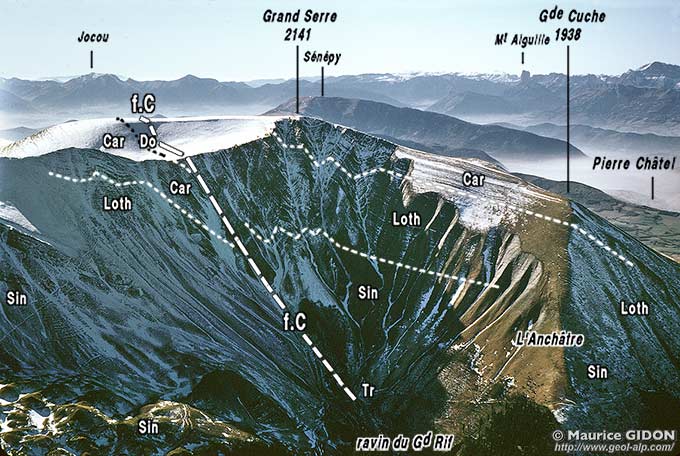 À l'extrémité sud des crêtes du Grand Serre, l'entaille du ravin de la Jonche, qui descend vers l'ouest du col de l'Ollière, donne une bonne coupe de la succession stratigraphique de la montagne.