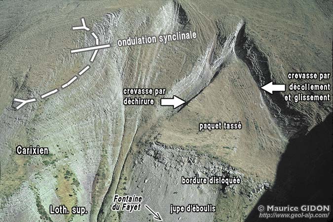 La première est une ondulation des strates qu'un examen attentif permet d'y déceler : leur pendage, toujours dirigé vers l'ouest, dessine d'abord une inflexion synclinale, puis s'accentue progressivement vers le bas. Cet enroulement en demi-anticlinal se moule apparemment sur celui du plancher de socle cristallin de l'hémigraben qui a été déformé de cette façon lors des serrages alpins transversaux, conformément au schéma général (voir aussi la page Tabor).