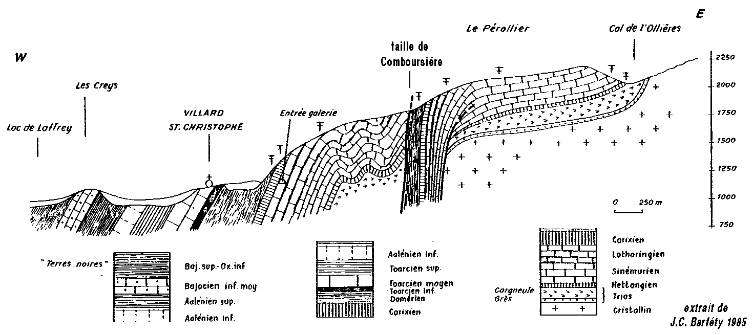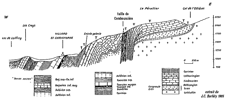 ![]() coupe d'ensemble du chaînon, du lac de Laffrey au col de l'Oullière ; extrait de J.C. Barféty, 1985 (présentation légèrement retouchée). L'incurvation en demi anticlinal des couches entre Villard Saint-Christophe et le Pérollier correspond à l'anticlinal de la Salle en Beaumont qui affecte, au sud de l'entaille de la Bonne, la marge occidentale des montagnes du Beaumont (voir pages "Valbonnais" et "Saint-Michel-en-Beaumont") |