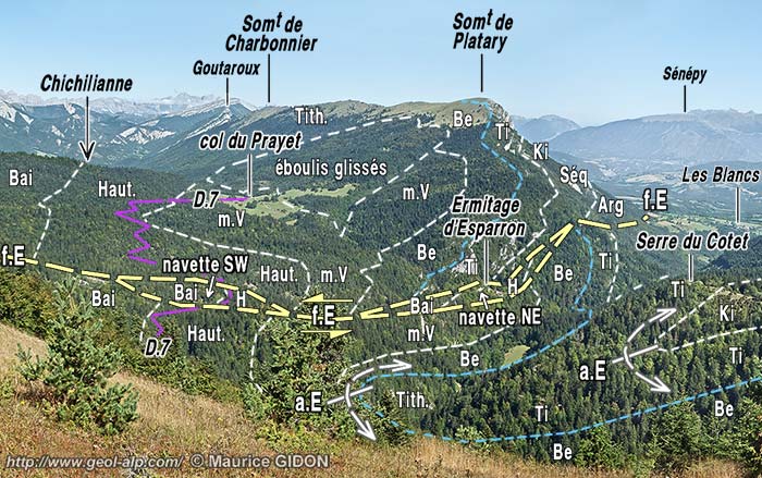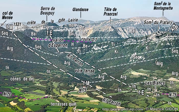 Du côté occidental les pentes plus escarpées qui les dominent, à peu près en amont du tracé de la N.75, sont celles des abords nord-orientaux du col de Menée. Du côté nord du vallon d'Esparron la crête inférieure du rebord subalpin, formée par la barre tithonique s'y termine par le sommet du Platary. Ce dernier montre un détail intéressant : il s'agit d'une faille de chevauchement dont l'importance est mineure mais qui attire l'attention par son sens de déversement "rétroverse" (vers l'est), analogue à celui des cassures des environs de Gresse.