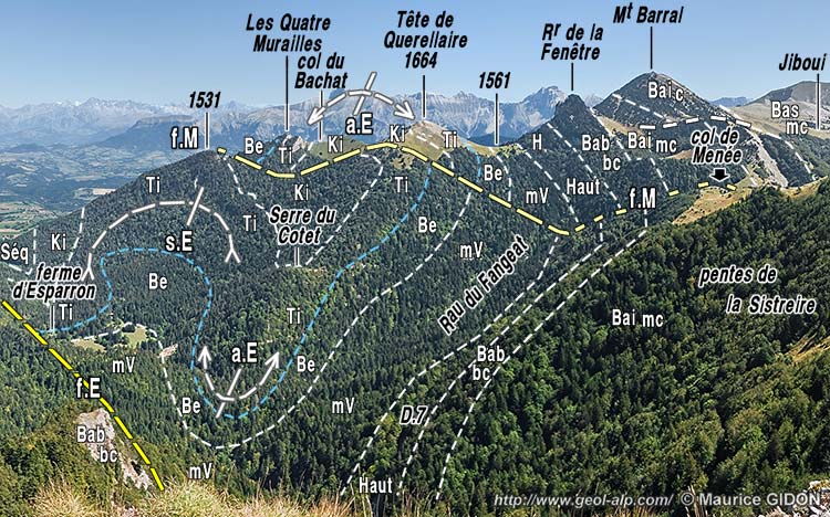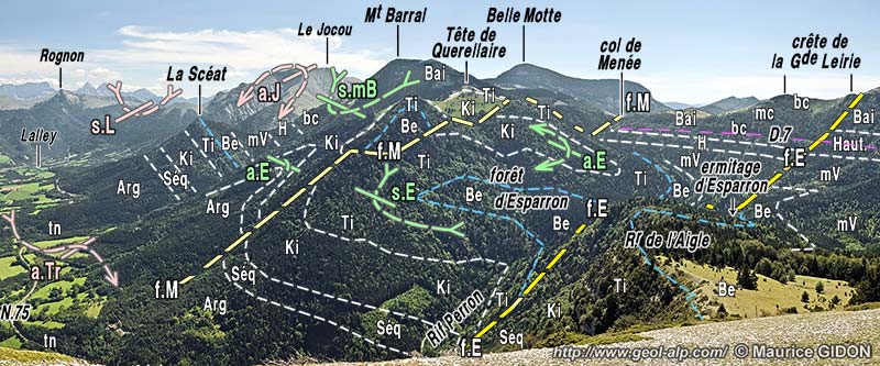 Sur le revers sud de la crête Leirie - col de Menée (crête de partage des eaux entre Drac et Drôme) les deux failles d'Esparron et de Menée coupent le crêt émoussé formé par le Barrémien inférieur (voir les pages Belle Motte et Combau); mais elles n'y induisent qu'un faible décalage horizontal des contours stratigraphiques. Leur tracé s'accompagne surtout d'un abaissement d'un compartiment intercalaire (qui apparaît ainsi comme un graben atypique, puisque limité par des failles verticales).