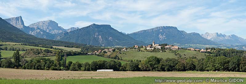 ![]() Le village du Percy et le Trièves, vus de l'ouest, depuis les abords nord du hameau des Blancs, 5 km au sud de la gare de Clelles sur la route N.75 (à droite : le village du Monêtier du Percy). Ce cliché donne une vue d'enfilade de la surface du plateau alluvial rissien, recouvrant les Terres Noires, du cœur du Trièves : en arrière-plan il s'étend au pied du chaînon de l'Obiou (extrémité septentrionale du Dévoluy) jusqu'à Mens, au pied du Châtel, à gauche. Il en émerge, à droite, le cône du Ménil, qui est le plus septentrional des reliefs de la bordure méridionale du Trièves. |