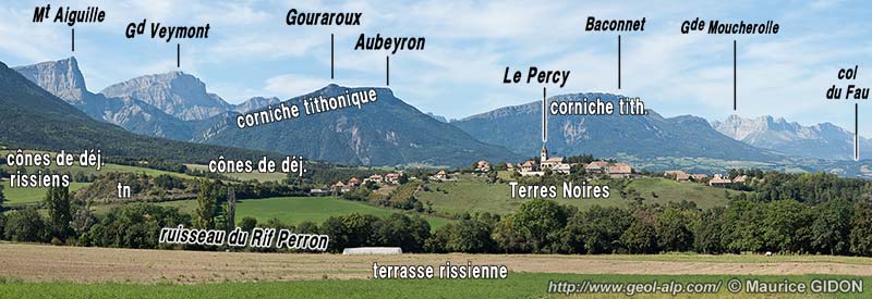 En rive méridionale du Rif Perron on ne retrouve plus, dans le paysage, le tracé régulier de la corniche tithonique, qui, partout au nord du Percy, domine de sa muraille continue et presque rectiligne(voir cliché en haut de page) les glacis quaternaires du Trièves proprement dit.
