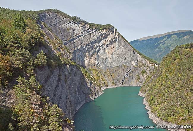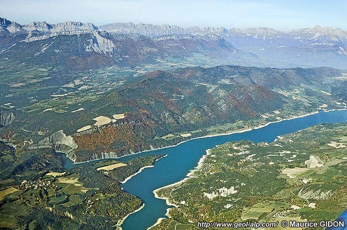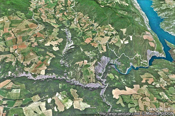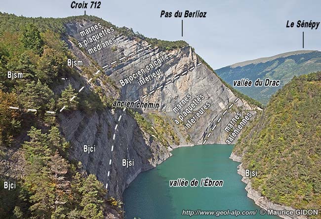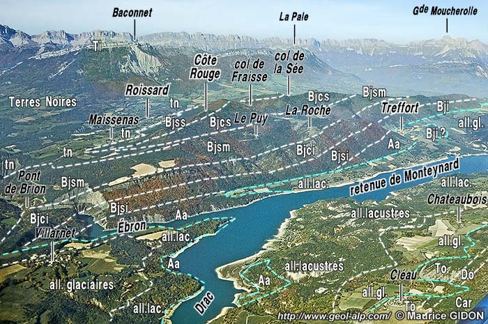 ![]() La montagne de Côte Rouge et la retenue de Monteynard, vus de l'est, d'avion (Le Monestier-de-Clermont est caché derrière le col de la Sée). Les tirets vert d'eau correspondent à la limite entre les affleurements rocheux et le colmatage alluvial de la vallée du Drac. La succession calcaréo-argileuse du Bajocien inférieur peut se subdiviser objectivement en plusieurs niveaux dont les deux inférieurs se suivent clairement dans le paysage (ce qui n'apparaît malheureusement pas sur la carte géologique, feuille La Chapelle, pas plus que sur la feuille Vif : voir la page "Sinard"). Bjss = niveau supérieur de marnes à petits lits pluri-centimétriques de calcarénite, se débitant en plaquettes rousseâtres ; Bjcs = niveau supérieur à bancs calcaires pluri-décimétriques ("Bajocien calcaire" sensu-stricto) ; Bjsm = niveau médian de marnes à plaquettes rousseâtres ; Bjci = niveau inférieur à bancs calcaires pluri-décimétriques ("Bajocien calcaire" sensu-stricto) ; Bjsi = niveau inférieur de marnes à plaquettes rousseâtres ; Aal = marnes aaléniennes . |