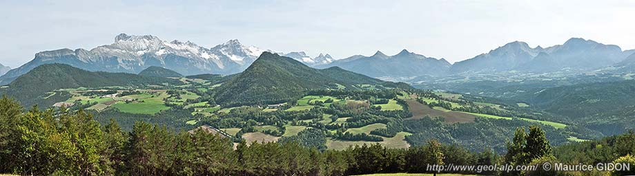 Cette "cuesta bajocienne" ne fait que prolonger celle, orientée N20°, qui court depuis Vif jusqu'à Monestier de Clermont. Mais à partir de cette localité son orientation s'infléchit progressivement pour devenir N 150°. Son épaisseur (ici proche de 1000 m) est aussi forte que plus au nord et elle ne paraît s'expliquer que par une accumulation particulièrement forte de sédiments terrigènes. En effet l'hypothèse de redoublements tectoniques envisagée pour les collines bordières de Belledonne n'est pas compatible avec le fait que l'on peut y distinguer, sur toute la longueur de l'arc Grenoblois une succession similaire de niveaux constitutifs, depuis ces collines jusqu'à celles des abords septentrionaux de Mens. Par ailleurs à l'est de Roissard, sur l'échine du Bois de Maissonas, on constate que les lits de marnes à plaquettes de la partie supérieure de la succession bajocienne ne semblent pas disparaître en s'engageant sous les Terres Noires qui affleurent en contrebas ouest, mais reposer sur elles. Cette géométrie pourrait s'interpréter par un redoublement par chevauchement, mais elle s'explique plus vraisemblablement par un passage latéral progressif entre marnes à plaquettes et Terres Noires franches, le taux de plaquettes diminuant d'est en ouest. |