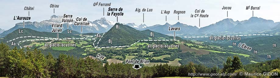 Au sud de ses gorges l'Ébron prend un cours parallèle à la direction de couches en creusant son lit sensiblement le long de la limite orientale des Terres Noires. Comme à cette latitude le Drac infléchit son cours vers l'est cela laisse les marnes aaléniennes dessiner une large combe qui s'élève jusqu'au col de Cornillon. La cuesta bajocienne forme le Serre de la Fayolle et se prolonge encore jusqu'au Grand Fays, à l'ouest de Mens, où elle s'interrompt, tranchée par la grande faille du Thaud (voir la page "Mens").