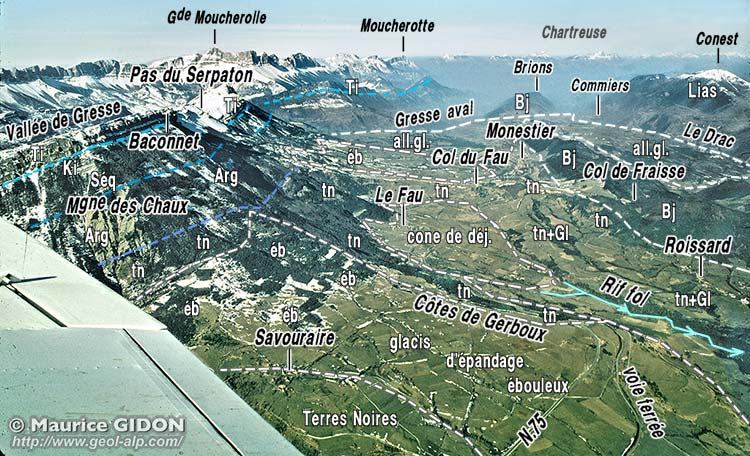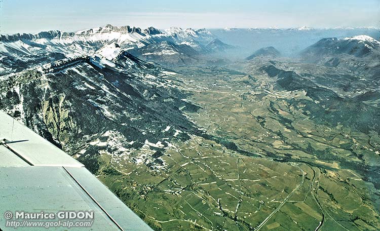 ![]() Le rebord subalpin et l'extrémité septentrionale du Trièves occidental vus du sud, d'avion, depuis l'aplomb approximatif de Clelles. Entre le col du Fau et le rebord des Côtes de Gerboux les ravinement récents, maintenant collectés par le Rif fol, ont décapé l'épandage ébouleux qui recouvre et remanie les alluvions glaciaires. Le torrent du Rif fol a pour source les ravins du Baconnet (voir la page "Monestier") et il a étalé à leur débouché le cône de déjections du Fau, qui est le dépôt le plus récent de ce secteur : l'ampleur de ce cône témoigne de ce que le creusement de ces ravins est également récent. |