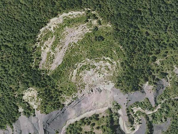 ![]() Détail de la zone de détachement amont, vue de la rive gauche, aux abords de Roissard (cliché original obligeamment communiqué par Mr. François LANNES) |