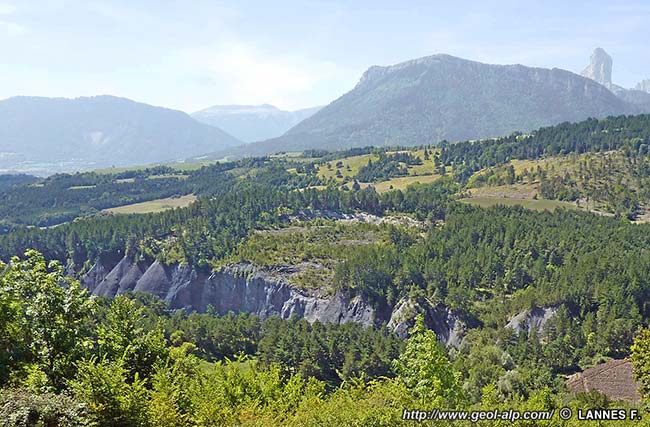 En fait le glacis alluvial du Trièves occidental est fragmenté à cette latitude en panneaux séparés par des entailles de ravins. En particulier sa partie orientale, qui correspond au versant ouest de la cuesta bajocienne et sur laquelle sont implantées les deux principales localités de Roissard (au nord), et de Lavars (au sud), a été séparée de celle, occidentale, des pentes de Saint-Michel-les Portes et de Clelles par des cours d'eau orientés plutôt N-S (selon la direction du sillon subalpin) qui sont au nord le Riffol et au sud le cours aval de l'Ébron. L'un comme l'autre (ainsi d'ailleurs que leurs affluents en provenance de l'ouest, les torrents de la Grosse Eau et d'Orbannes) ont entaillé dans les alluvions quaternaires des ravines assez profondes pour mettre à nu leur substratum de Terres Noires et même s'y inscrire en canyons profonds de plusieurs dizaines de mètres : voir le complément en fin de page).