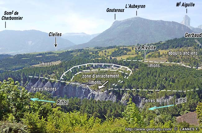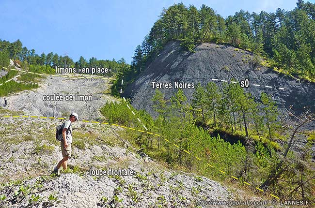 ![]() La coulée de limon issue de la zone de détachement aval (rive gauche), vue depuis les abords du lit du torrent de Riffol (cliché original obligeamment communiqué par Mr. François LANNES). La coulée de limon apparemment emprunté un vallonnement ancien de la surface d'érosion wurmienne ; s0 = strates au sein de Terres Noires : elles sont clairement recoupée par le flanc du thalweg qui canalise la coulée de boue. |