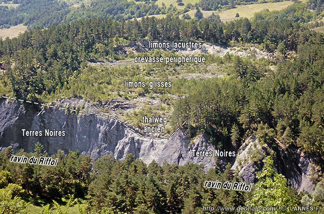 Ici la couverture quaternaire se résume à quelques mètres d'épaisseur de limons lacustres qui ont garni le fond de l'ancien lac du Trièves au maximum wurmien. L'entaille du torrent montre que la surface du substratum que constituent les Terres Noires est presque horizontale mais présente localement des zones relativement déprimées, qui sont sans doute des thalwegs creusés antérieurement au remplissage du lac du Trièves. D'autre part le fait que la couche de limon lacustre repose sur les marnes imperméables des Terres Noires l'a certainement aidé à se gorger d'eau et devenir très malléable.