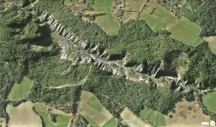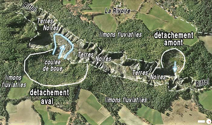 Là où l'entaille du Riffol traverse un de ces anciens thalwegs cela a déclanché une sorte de vidange de la poche de limon ainsi mis à nu et causé, de proche en proche, une rupture de la stabilité de la tranche de ce limon : elle s'est arrachée par paquets successifs, chacun limité par une crevasse presque circulaire de plus grand diamètre à chaque fois, qui tendent à s'évacuer en direction du lit du torrent.