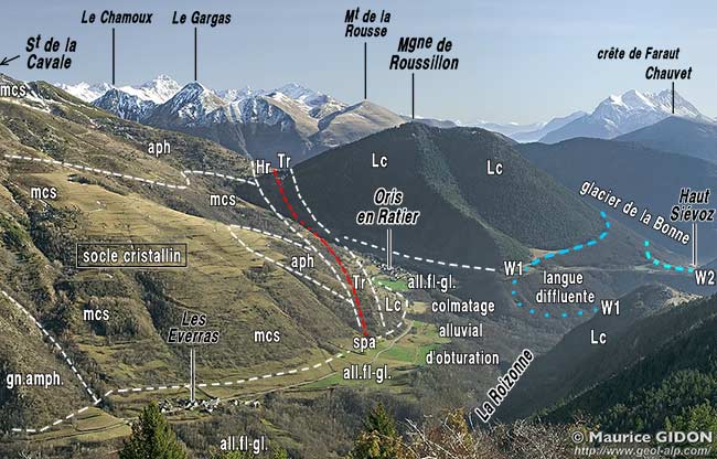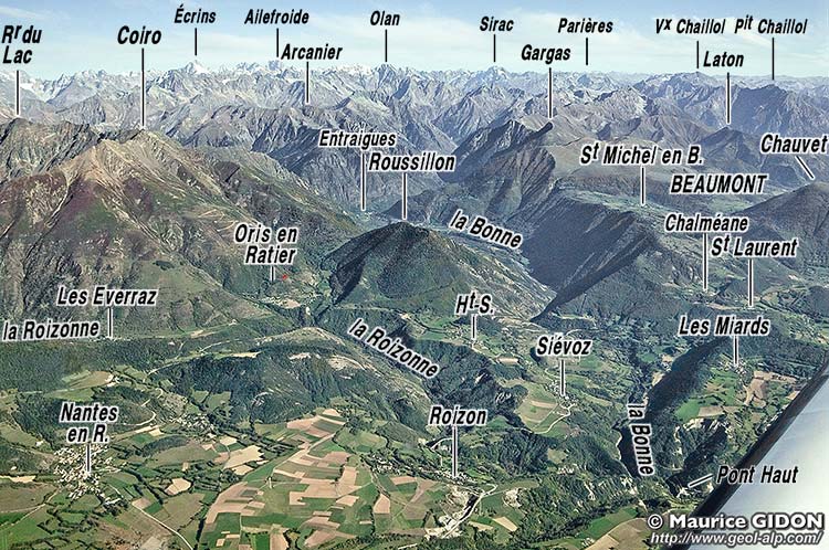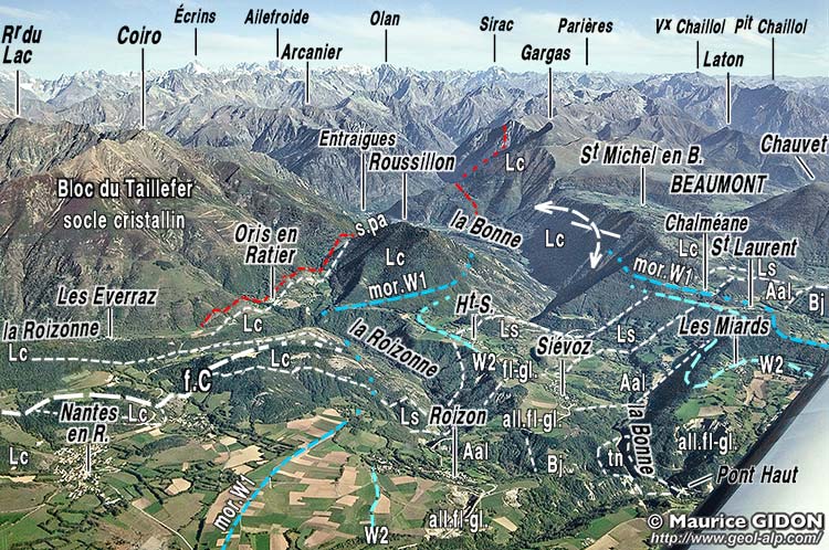 image sensible au survol et au clic![]() Les montagnes du confluent Roizonne - Bonne vues d'avion, du NW, de l'aplomb nord de La Mure (Ht-S. = Haut-Siévoz). f.C = faille de Comboursière (voir la page Grand Serre) ; mor.W1 = moraines du maximum de Würm, délimitant latéralement le lobe frontal de la langue du glacier de la Bonne à cette époque (une diffluence en direction de l'amont de la vallée de la Roizonne s'ébauchait alors au niveau d'Oris) ; W2 = deuxième vallum glaciaire, emboité en contrebas, créé lors de la recrue du Würm III. |