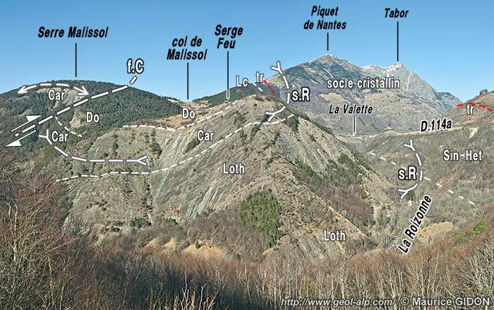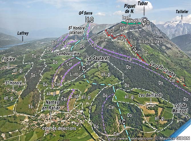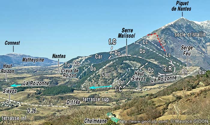 Les reliefs de la bordure orientale de la Matheysine s'abaissent vers le sud, à partir des contreforts du Tabor (Piquet de Nantes), jusqu'au niveau de l'entaille d'érosion qu'a ouverte la Roizonne (vallée de Lavaldens) entre ce dernier et la crête Armet - Coiro (voir la page Armet). Cette entaille, bien que profonde, est cependant dénuée de toute origine structurale : le cours amont de la rivière tranche profondément au cœur des affleurements du socle cristallin du bloc du Taillefer, formée principalement de micaschistes et de coulées volcaniques interstratifiées qui appartiennent à la série "corticale" du socle, en ne suivant ni cassure ni bande d'affleurements plus spécialement faciles à éroder.
