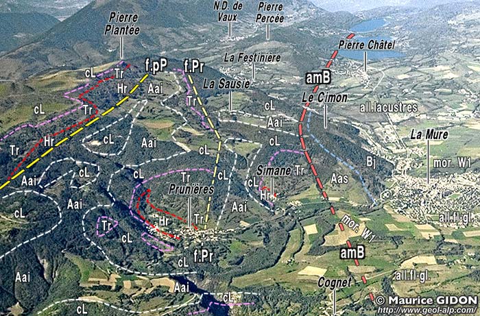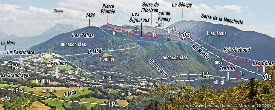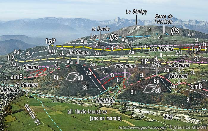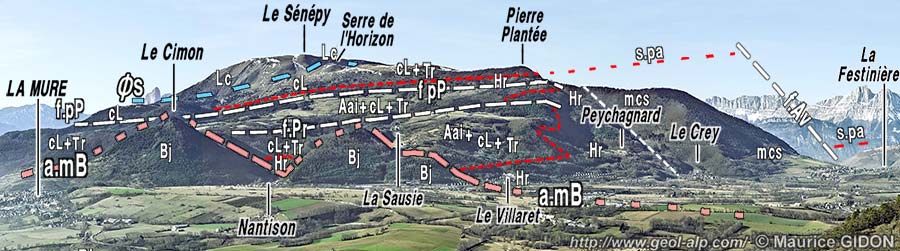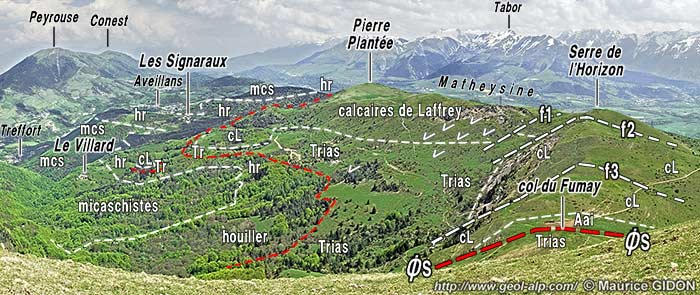 ![]() même fenêtre Panorama des montagnes au nord-ouest de La Mure, vu de l'est depuis le col de Malissol (à l'est de Nantes en Ratier). ØS (en bleu) = chevauchement du Sénépy (masqué derriere le Serre de l'Horizon) ; f.pP = faille de la Pierre Plantée ; f.Pr = faille de Prunières ; amB (en rouge clair) = accident médian de Belledonne. cL = calcaires de Laffrey ; Aai = calcschistes de l'Aalénien inférieur ; mcs = micaschistes. On perçoit très bien le plongement régulier vers le sud (vers la gauche) de toutes les lignes structurales. La surface de la pénéplaine anté-triasique (s.pa, en rouge) qui se profile à la voûte du bombement du socle cristallin, disparaît, érodée, au nord de la Pierre Plantée ; elle devait continuer à s'élever dans cette direction( tirets rouges dans le ciel) puis s'effondrer par le jeu de la faille d'Aveillans (f.Av), qui abaisse le houiller de cette localité par rapport aux micaschistes du col de la Festinière. |