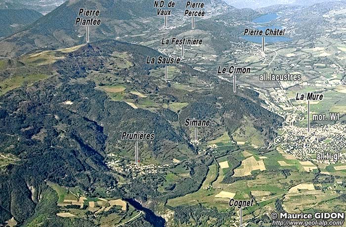 Au sud du Mont Cimon et de la Mure les pentes de ce versant de la Matheysine se terminent du côté méridional par un versant qui regarde vers le SE, ce lui fait trancher obliquement les deux marches d'escalier décalées par les failles de Pierre Plantée et de Prunières. Cette disposition met en évidence le fait que les vallons NW-SE de Simiane et de la Combe de Prunières y sont dirigés par l'existence d'affleurements de houiller qui représentent des cœurs d'anticlinaux. C'est là une complication de la structure qui ne fait en réalité que prolonger celle qui s'observe plus à l'ouest dans les pentes orientales du grand vallon de Saint-Arey (voir la page "Sénépy").