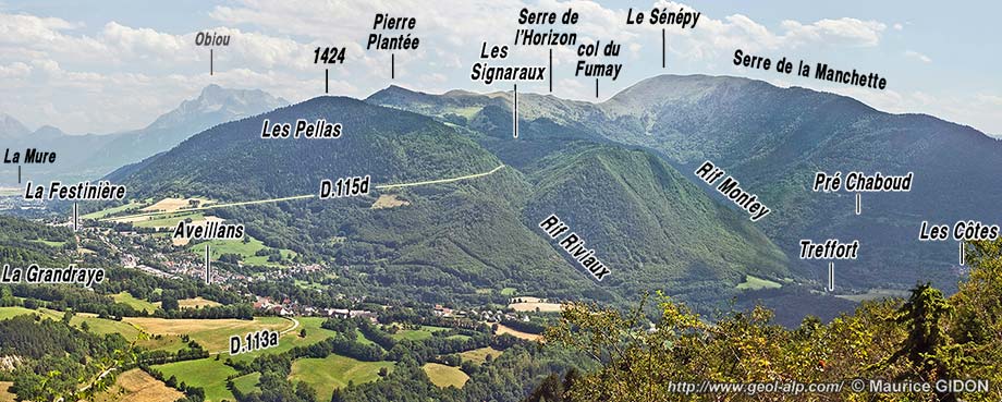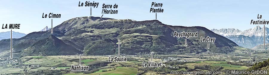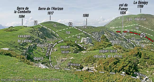 Sur la crête elle-même il faut aller jusque à son extrémité sud-occidentale ("Le Fumay") pour voir les calcaires de Laffrey disparaître sous des marno-calcaires aaléniens. Ces derniers s'engagent, au col du Fumay, par l'intermédiaire de la cassure majeure qu'est le chevauchement du Sénépy, sous les dolomies triasiques et les spilites qui représentent la semelle stratigraphique de la succession liasique épaisse, de type "dauphinois" ordinaire, qui forme ce sommet.