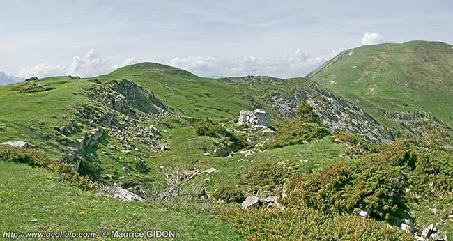La grande simplicité de structure de cette crête est seulement perturbée par quelques petites failles extensives N-S, à compartiment occidental abaissé. Son versant nord domine une zone de replats où les dolomies et spilites triasiques affleurent de façon très discontinue. Le déblaiement par l'érosion de ce niveau peu résistant a été également à l'origine de quelques tassements de versant bien caractérisés dont les crevasses continuent actuellement à s'ouvrir ...
