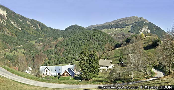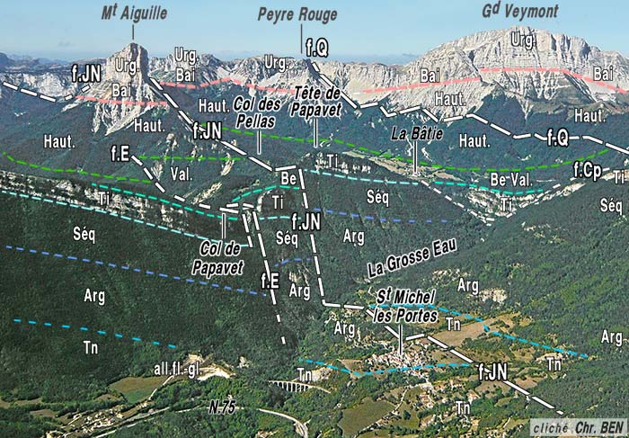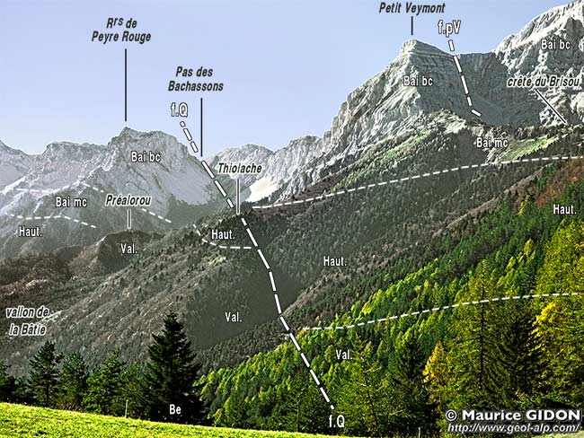 Le rentrant E-W du ravin de la Grosse Eau se termine 2 km à l'ouest du village en décrivant un brutal changement d'orientation : il se coude à 90° vers le sud pour rejoindre le vallon de la Bâtie en contournant par le sud la Tête du Papavet, c'est-à-dire par un tracé en baïonnette empruntant le ravin des Pellas. Pourtant le lit du torrent avait franchi la barre tithonique et même atteint les couches berriasiennes inférieures, dans lequel il n'aurait eu aucune peine à se poursuivre. Mais il bute là contre un mur tithonique, orienté N.20°, qui s'avère être un miroir d'une faille.