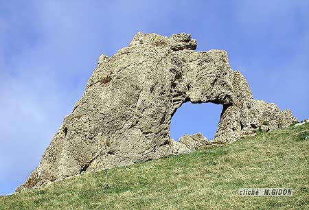Même à distance on distingue l'aspect vacuolaire de la cargneule. L'arche mesure environ 3 m de haut (pour éviter son effondrement elle a été renforcée d'un muret de soutènement pyramidal, du côté arrière droit). |