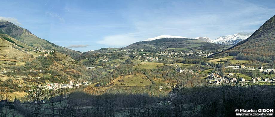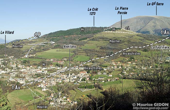 Les affleurements de grès et schistes pélitiques du houiller décrivent grossièrement un mouvement anticlinal. Ils sont limités du côté sud par la faille d'Aveillans (f.Av), presque E-W, au sud de laquelle le socle cristallin du Dôme de la Mure affleure largement dans les collines boisées des environs des Signaraux. |