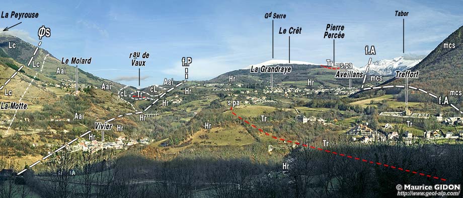 "Lc" désigne les affleurements de calcaires de Laffrey qui forment la crête elle-même. |