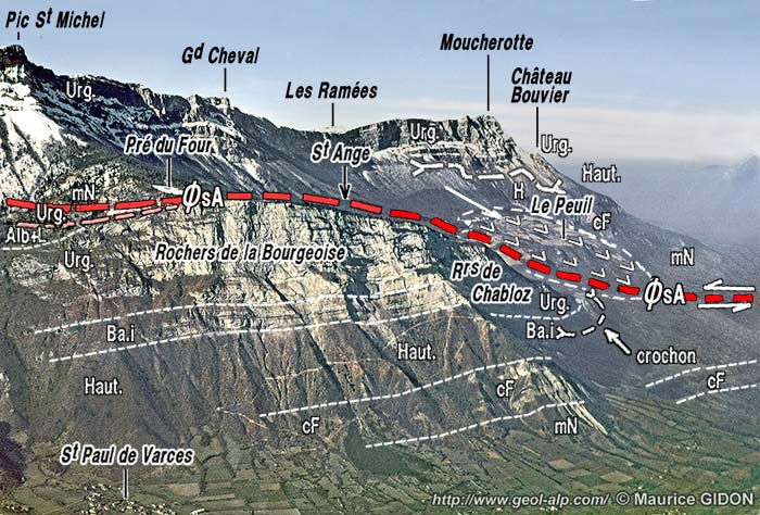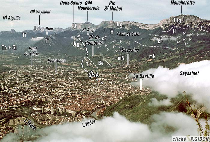 Les pentes du massif du Vercors donnent une coupe de la série stratigraphique des massifs subalpins, mais cette dernière est perturbée par le chevauchement de Saint-Ange (ØsA) qui redouble la corniche urgonienne (voir la page "Pic Saint-Michel"). En avant-plan le promontoire méridional de la Chartreuse (Mont Rachais) est mangé par un nuage de mi-pente qui cache également l'entrée de la trouée de l'Isère entre Chartreuse et Vercors. |