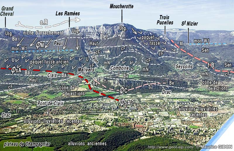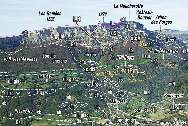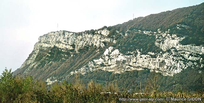Cette interprétation est corroborée par le fait que les affleurements rocheux calcaires constituant ce ressaut sont largement masqués sous un matériel ébouleux et s'avèrent souvent désorganisés au sein de ce dernier, même si leur répartition respecte globalement la succession originelle : les calcaires du Fontanil se localisent plutôt vers le bas, notamment du côté nord au dessus de Malivers, alors que les paquets d'Urgonien forment l'armature de la partie haute du rebord.