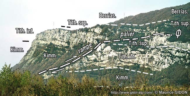 Ces failles à rejets modestes sectionnent le Tithonique en biseau car elles ont un faible pendage vers l'est. Leur géométrie comme leur sens de rejet font évidemment présumer qu'elles sont probablement des accidents satellites d'un chevauchement plus important passant plus bas que le pied de la corniche, que l'on peut clairement considérer comme le prolongement septentrional du chevauchement de Saint-Ange (voir la coupe).