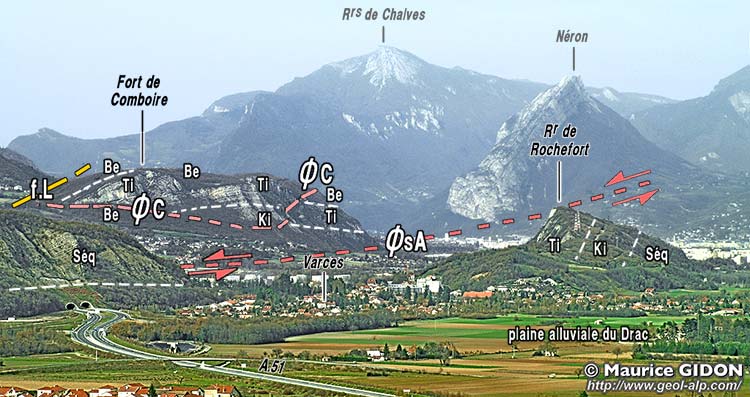 C/ Au niveau de la plaine alluviale du Drac, au pied des pentes orientales du Vercors, les deux échines rocheuses de Comboire et de Rochefort émergent respectivement au nord et au sud de Pont-de-Claix. L'une et l'autre sont constituées par la barre tithonique à pendage ouest et de même azimut, proche de N 15. Mais elles ne se placent pas dans le prolongement l'une de l'autre puisque la première est décalée d'environ 2 km vers l'ouest par rapport à la seconde, dont le pendage est en outre bien plus fort .