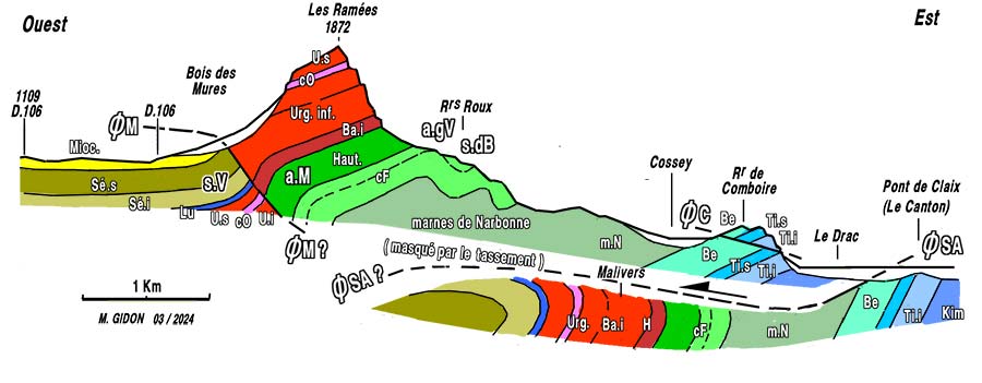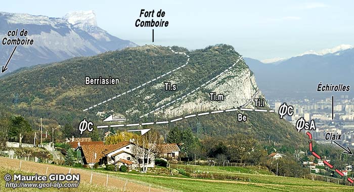 Ces couches butent finalement contre le bord septentrional du chevauchement du Moucherotte (le long de la faille des Bruziers) et s'y font sectionner en biseau par la faille des Ferrières (cliché ci-dessus). C'est donc au matériel transporté vers le NW par le chevauchement du Moucherotte qu'appartiennent les couches de ce versant et notamment les plus anciennes qui forment la butte de Comboire.
