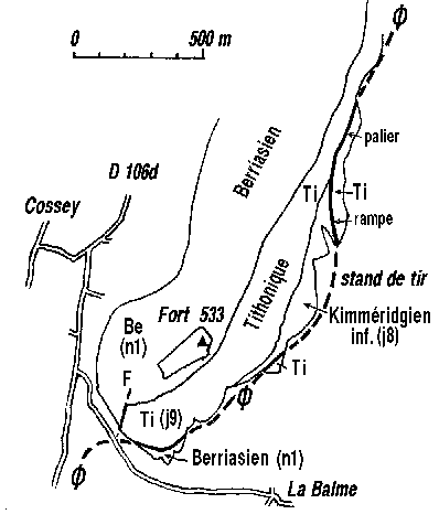 1 - La pente supérieure du versant qui descend depuis le Moucherotte vers les Rochers de Comboire, montre simplement la succession stratigraphique des couches crétacées sous-jacentes à l'Urgonien. Quoique assez régulièrement déclive cette pente est tout de même accidentée par le ressaut des Rochers Roux, formé par les calcaires du Fontanil, qui court en continu à flanc de pente. Plus bas elle est fortement échancrée par la selle N-S de Cossey, couverte d'alluvions glaciaires : celles-ci masquent simplement le passage stratigraphique entre les marnes de Narbonne valanginiennes et les niveaux marno-calcaires berriasiens.