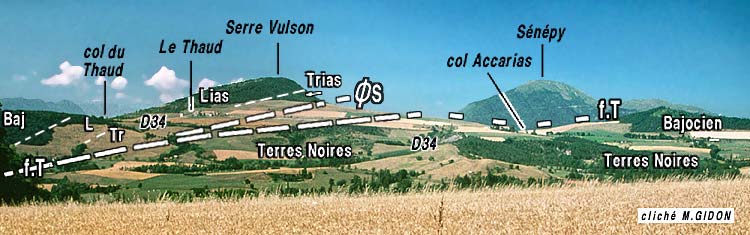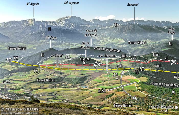 Quoi qu'il en soit il y a là une cassure que l'on suit jusqu'au hameau des Plantes, 2 kilomètres à l'ouest de Mens, mais dont on perd la trace au delà, dans le secteur de Prébois. En effet de part et d'autre de son prolongement probable, n'affleurent plus que des Terres Noires au sein desquelles il est bien difficile de faire la différence entre celles situées à l'ouest (sans doute d'âge Bajocien supérieur) et celles affleurant à l'est (certainement plus récentes).