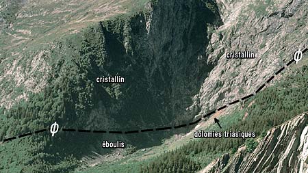 ![]() Détail du ravin du Clôt de l'Homme vu du NE, depuis le col de la Buffe (Oulles) Ø = faille de chevauchement du Taillefer. |