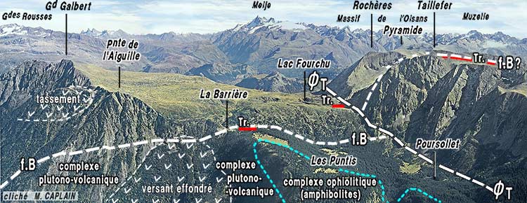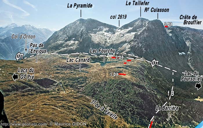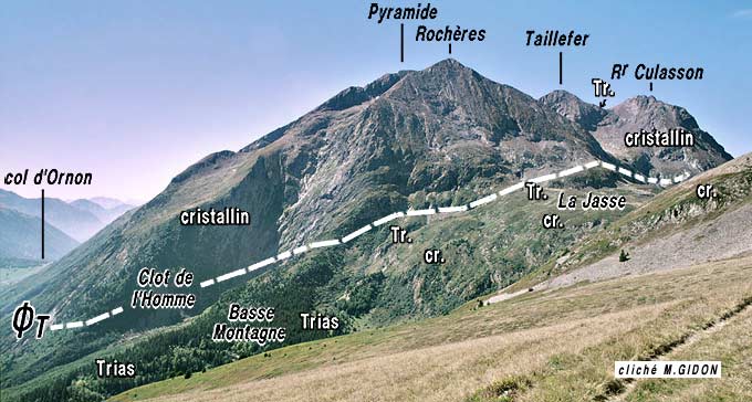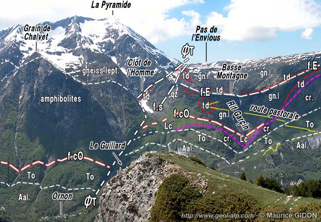 ![]() La retombée orientale du chaînon du Taillefer vue de l'est, depuis le sommet de Prégentil. f.cO = faille du col d'Ornon ; ØT = chevauchement du Taillefer (f.s = surface de cassure secondaire) ; f.E = faille de l'Echaillon (voir la page "Grand Galbert") ; cr. = lame de cristallin (amphibolites) interstratifiée, en olistolite, dans le Toarcien et coiffant la faille du col d'Ornon dans les pentes qui s'élèvent vers la droite (vers le nord) : sa surface de glissement est figurée en tirets pourpres : voir à ce sujet la page "Ornon". td = dolomies triasiques ; qz = filon de quartz d'épaisseur pluri-métrique soulignant la faille f.s dans le flanc sud-est de la bosse cotée 1827. |