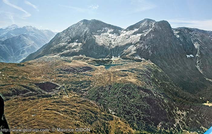 ![]() Le plateau des lacs et les abrupts septentrionaux du Taillefer vus de l'ouest, d'avion, de l'aplomb de Séchilienne (clichés tirés du site de Michel CAPLAIN, http://geo.hmg.inpg.fr/mto/jpegs/). Les principaux affleurements de Trias sont marqués de rouge. Ils jalonnent la surface de la pénéplaine anté-triasique, qui est dénivelée par deux failles orthogonales : ØT = faille de chevauchement du Taillefer ; f.B = faille de La Barrière (prolongement méridional de la faille des Lessines) et son prolongement hypothétique entre sommet du Taillefer et Rocher Culasson. |