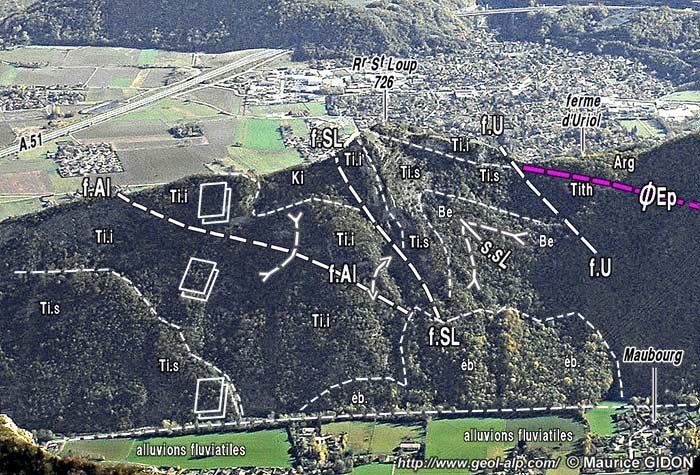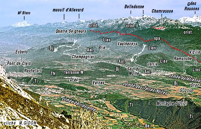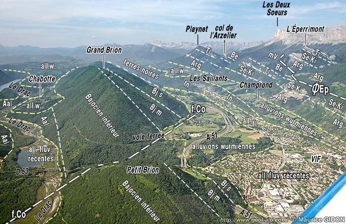 ![]() Les abords méridionaux de Vif (vallée de la Gresse), vus du nord d'avion depuis l’aplomb de Reymure. f.Co = faille (décrochement) de Cornage ; ØEp = chevauchement de l'Éperrimont. all.w. = alluvions fluvio-lacustres et glaciaires du colmatage wurmien de la vallée du Drac. Dans l'épaisse succession de la cuesta du Bajocien inférieur on a distingué 3 niveaux (comme dans les collines bordières de Belledonne) : les calcaires inférieurs, les marno-calcaires intermédiaires (Bjm) et les calcaires supérieurs (Bjs). |