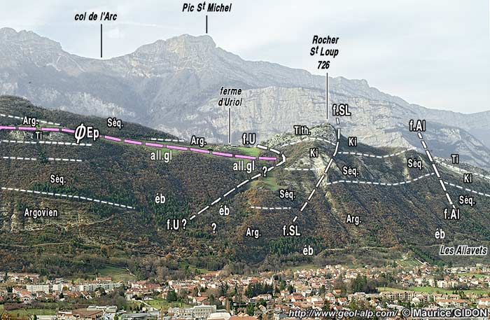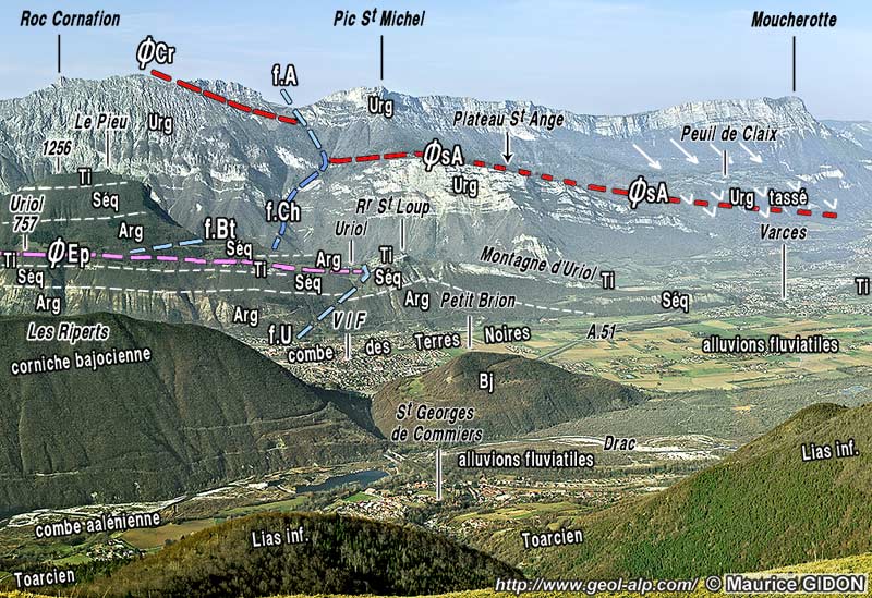 ![]() Le sillon subalpin à la latitude de Vif, vu de l'est, depuis le Conest (sommet de Beauregard). ØCr = chevauchement des Crocs ; ØsA = surface du chevauchement de Saint-Ange ; ØEp = surface du chevauchement de l'Éperrimont ; f.A = faille de l'Arc ; f.Ch = faille des Charbonniers ; f.Bt = faille de Btrise-Tourte ; f.U = faille transversale extensive d'Uriol. Les hautes pentes du rebord subalpin (à l'ouest de Saint-Paul de Varces), sont décrites à la page "Col de l'Arc" et le prolongement méridional de la crête de la montagne du Pieu à la page "Éperrimont"). |