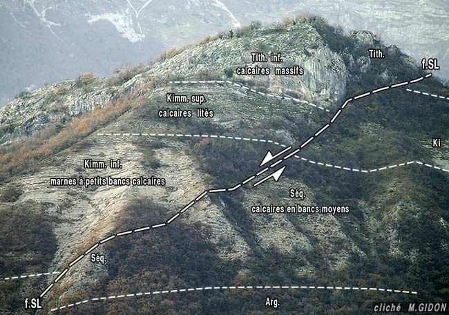 C'est à la faveur du jeu de ces cassures que Tithonique du Rocher Saint-Loup se détache sur cette crête (alors qu'immédiatement plus au nord c'est le kimméridgien qui affleure). En fait cette faille du Saint-Loup décale la barre du Tithonique suffisamment vers le bas pour montrer qu'elle est tordue en un synclinal à axe plongeant vers le SW, visible dans le versant ouest de la crête, ce qui la rebrousse vers l'ouest en un crochon* bien caractérisé (voir le second cliché ci-après).