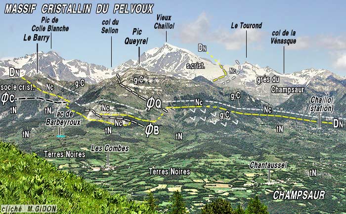 ![]() Le versant oriental du Champsaur à l'est de Saint-Bonnet vu du sud-ouest, depuis les pentes du Pic de Gleize. DN = Discordance du Nummulitique (surface de transgression) ; son tracé contourne la crête du Queyrel par l'est, dans la vallée du Riou Beyrou, pour réapparaître sur le versant sud du Vieux Chaillol. ØC = chevauchement (anté-nummulitique) du Chaillol (il est cacheté par la transgression nummulitique peu au sud du sommet du Barry) ; ØB = chevauchement (post-nummulitique) de Barbeyroux ; ØQ = chevauchement du Queyrel. Ces deux groupes de chevauchements sont de vergence opposée, le premier vers le S-SE (voir la page "Vieux Chaillol") les deux autres vers l'W-NW (voir la page "Pic Queyrel"). |