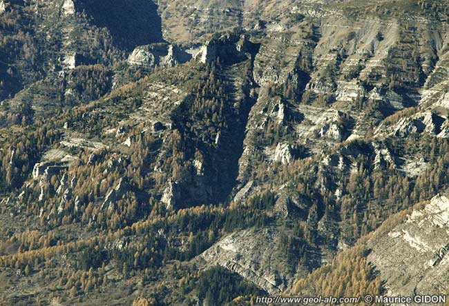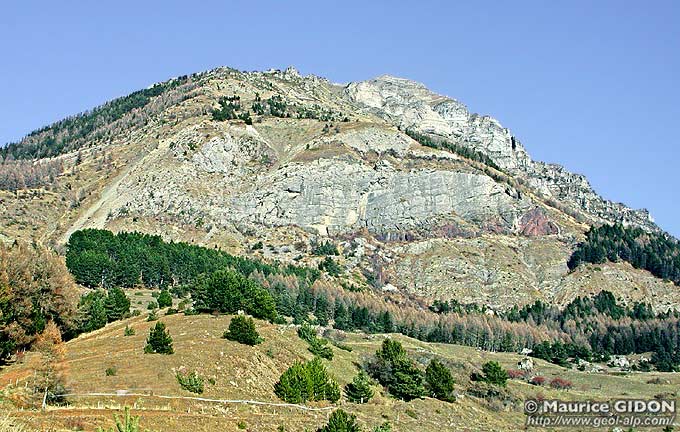 Au dessus du village de Chaillol (et de la station de Chaillol 1600) les pentes supérieures de rive droite débutent également par le ressaut de la barre des calcaires nummulitiques et sont couronnées, par des escarpements boisés qui sont entaillés dans la succession des gros bancs de grès du Champsaur. Elle est affectée par la faille de Famourou, qui est un accident similaire aux chevauchements de Barbeyroux et du Queyrel (voir la page "Queyrel"), mais de rejet beaucoup plus modeste, qui s'intercale entre ces derniers et le chevauchement, plus oriental, du Palastre.