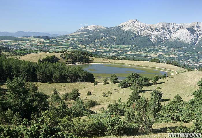 ![]() Le lac de Barbeyroux et la haute vallée du Champsaur vu de l'est, depuis les pentes dominant le lac de Barbeyroux. |
