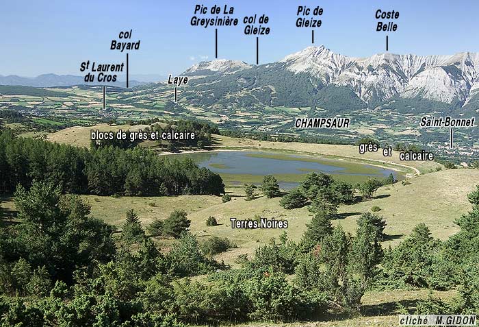 À la latitude de Saint-Bonnet les pentes de rive droite du Champsaur s'élèvent d'abord en pente douce car elles sont installées uniformément sur des Terres Noires (que cachent d'ailleurs le plus souvent des placages d'alluvions glaciaires et fluvio-glaciaires). Puis elles se redressent assez brutalement aux approches de l'altitude de 1500 m., où l'on atteint le pied des escarpements qui couronnent le versant et qui culminent au Pic Queyrel. et à Soleil Bœuf. De part et d'autre de la localité de Chaillol, vers l'est jusqu'au Drac (Pont du Fossé) comme vers l'ouest (soubassement du Pic Queyrel) ils sont formés par un chapeau de couches nummulitiques essentiellement formées par les "grès du Champsaur".