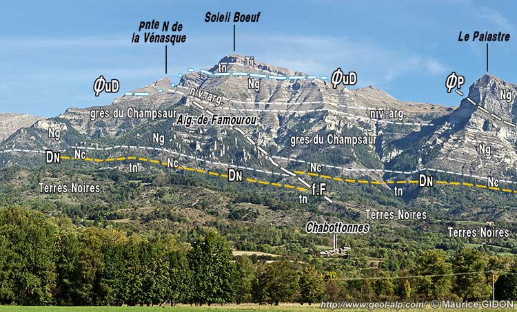 ![]() Les pentes de rive droite du Drac à la hauteur de Chabottonnes, vue de la D.944, en rive gauche du Drac, peu en amont de la Plaine de Chabottes. ØuD = surface de chevauchement de l'écaille ultra-dauphinoise de Soleil Boeuf ; f.F = faille de Famourou (il s'agit d'une cassure extensive dont le compartiment gauche est abaissé) ; ØP = chevauchement du Palastre (voir plus loin la page "Pont-du-Fossé") ; DN = surface de discordance des couches nummulitiques sur celles du Jurassique (ici uniquement des Terres Noires). |